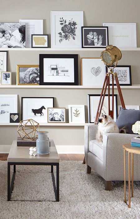 Ledges or very shallow shelves can be used to rest artwork against. They allow you to create the same look as a gallery wall, while also allowing you to swap out and rearrange pieces easily. It also creates an modern but casual look with an eclectic flair. Many people also apply the ledge idea to a fireplace mantel. Placing some taller framed pieces behind vases or sculptures creates a classy and stylish vignette.
